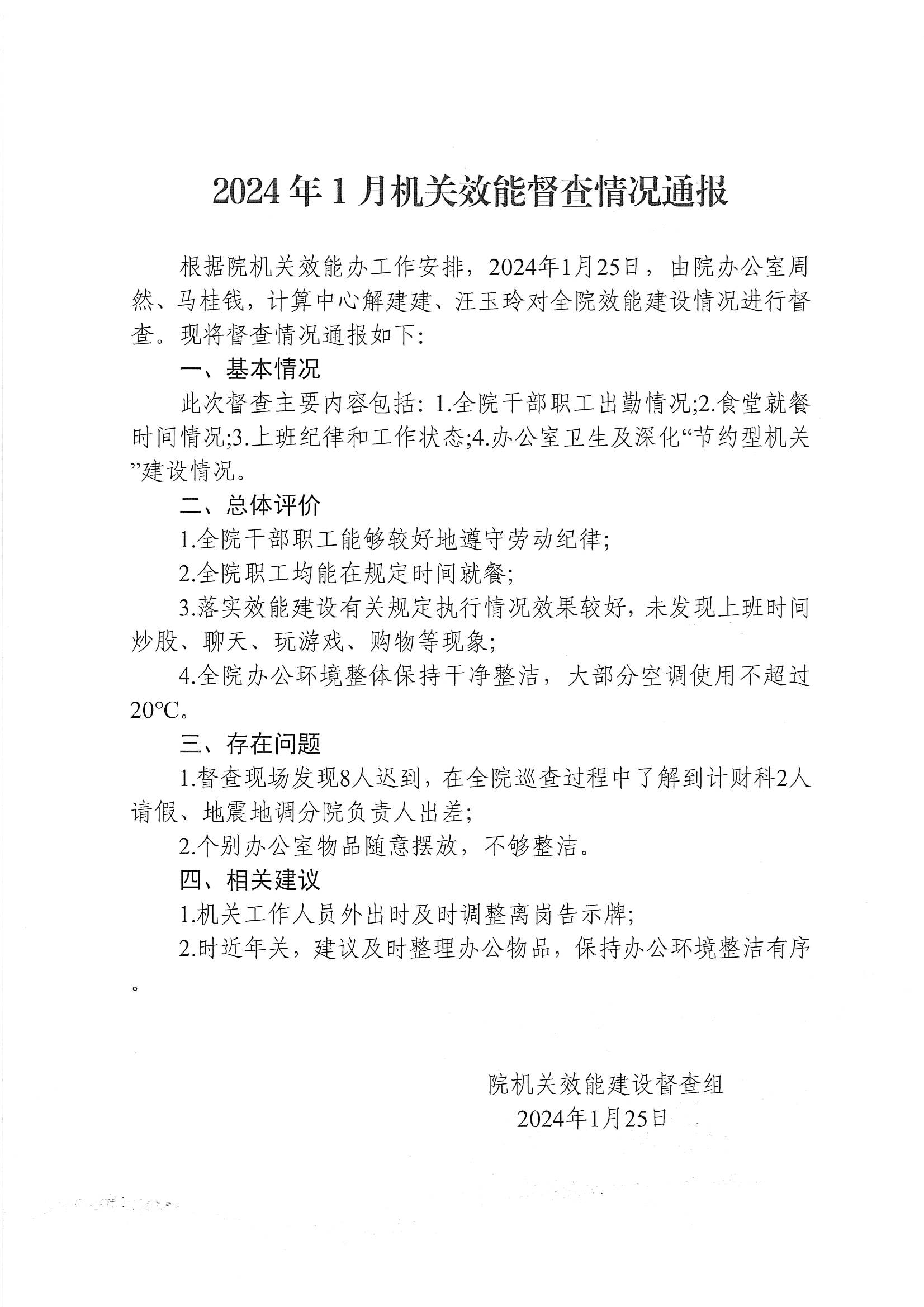 2024年1月机关效能监督情况通报