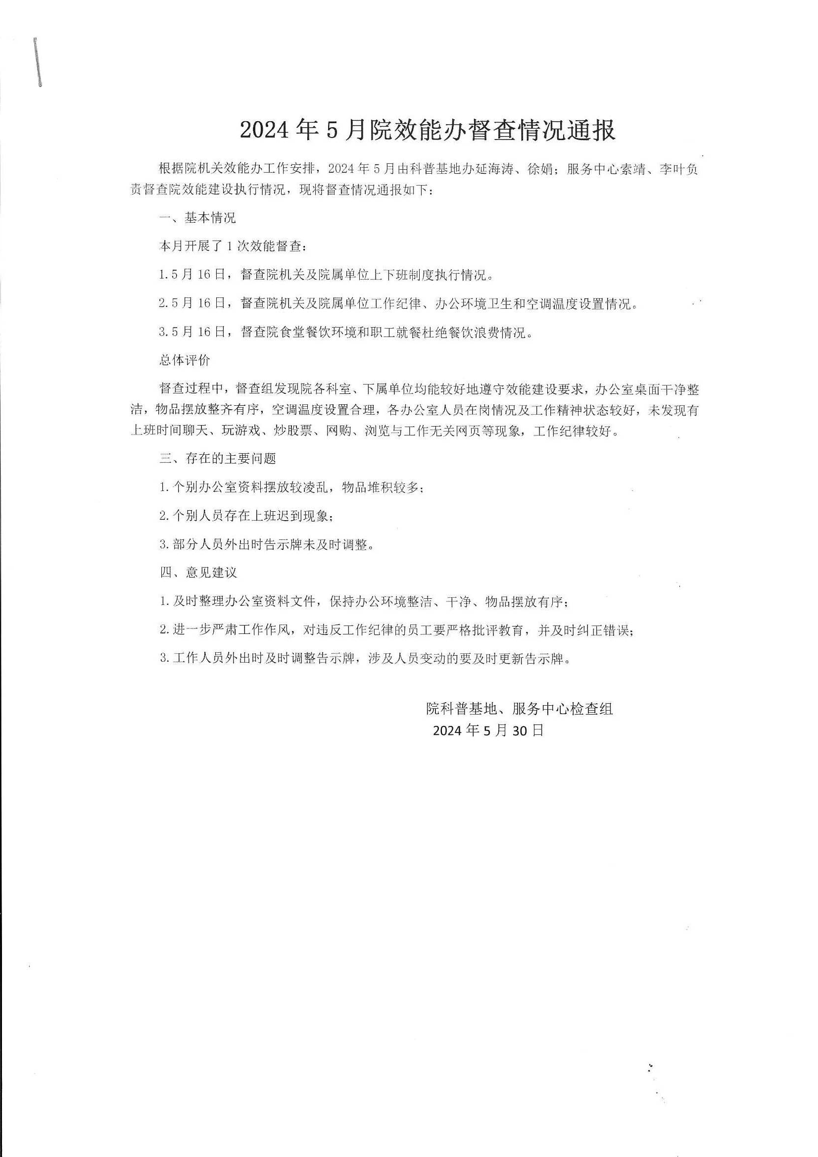 2024年5月机关效能监督情况通报