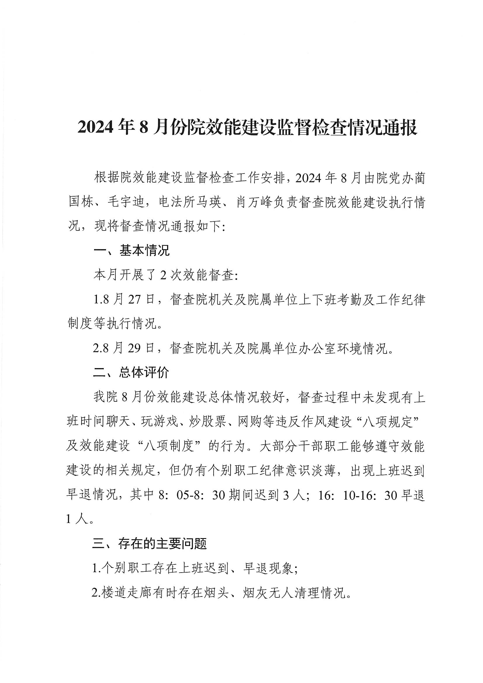 2024年8月机关效能监督情况通报