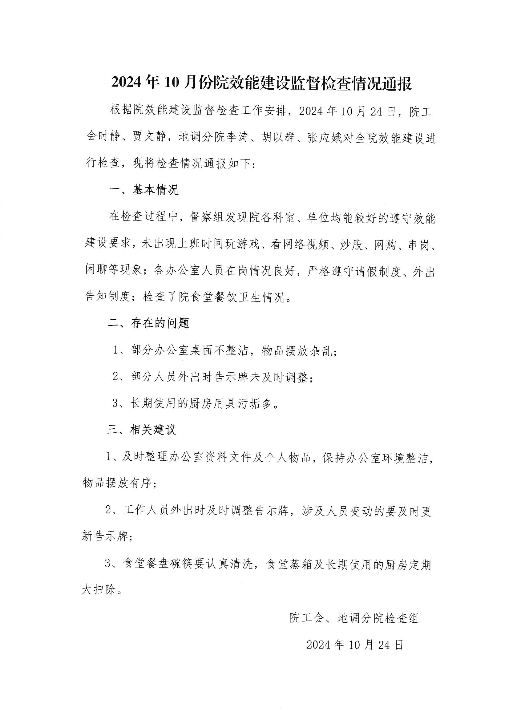 2024年10月机关效能监督情况通报