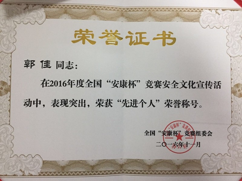 近日,从全国安康杯竞赛组委会获悉,我院职工郭佳在2016年度全国“