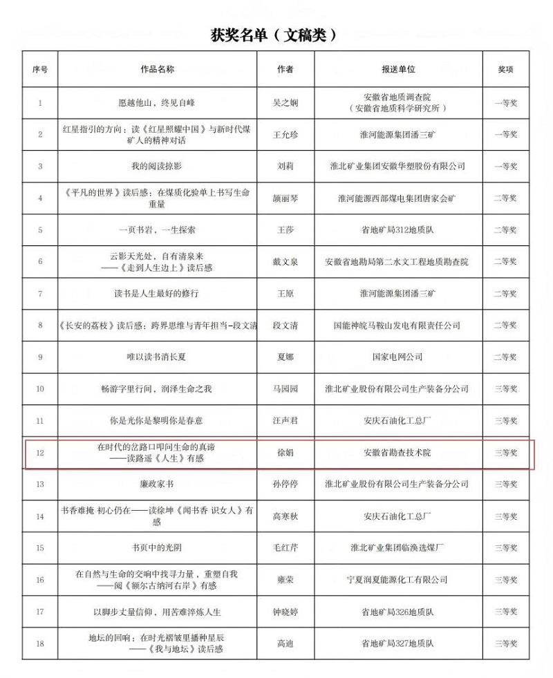 近日,省能源化学地质工会公布“云阅读·书润匠心”女职工读书作品征集活动评选结果。我院徐娟的读书心得作品《在时代的岔路口叩问生命的真谛——读路?!慈松涤懈小吩?12件文稿类作品中脱颖而出,荣获三等奖。