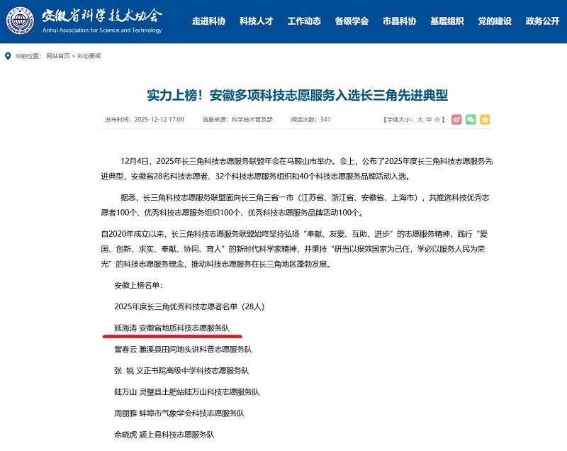 12月4日,2025年长三角科技志愿服务联盟年会在马鞍山市举办。会议公布了年度先进典型评选结果,我院科技工作者延海涛获评2025年度长三角优秀科技志愿者。