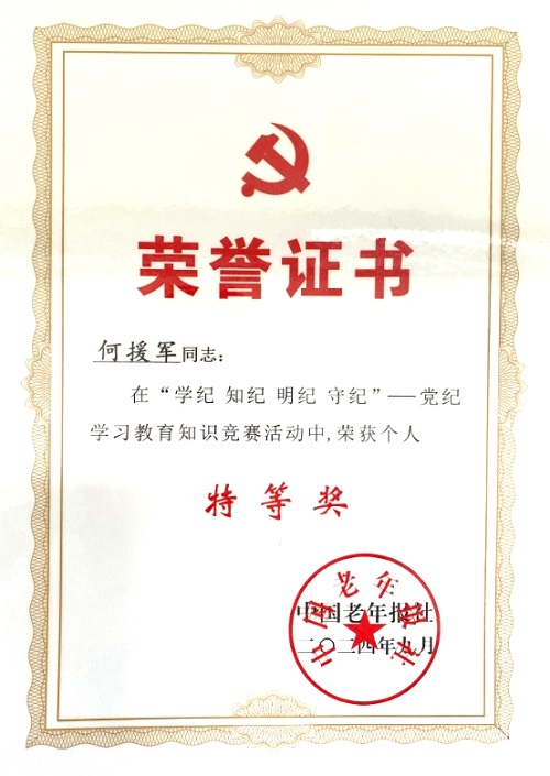 近日获悉,由中国老年报社举办的“学纪知纪明纪守纪——党纪学习教育知识竞赛”结果揭晓,我院荣获“集体组织奖”,何援军同志荣获个人“特等奖”。