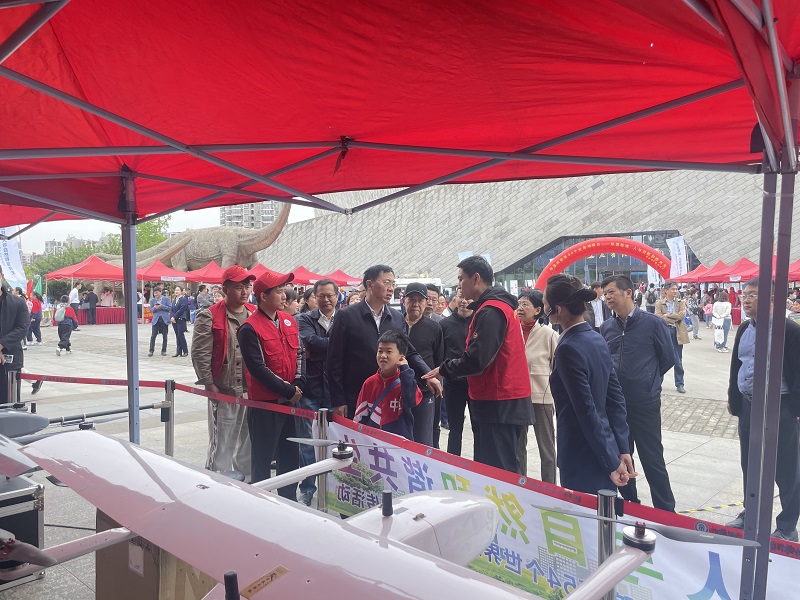 地球物理探测仪器展区,6台无人机整齐亮相,让大小“科技迷”们跃跃欲试、拍手叫好。在工作人员的指引下,金属管线探测仪、森林罗盘仪的现场体验,一个个小小“地质学家”从课堂走到了活动现场。
