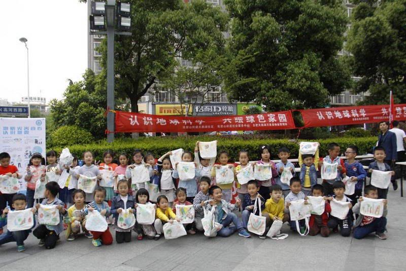 4月19日下午,由安徽省地质调查院和安徽省地质学会青年工作委员会主办,我院、政务区笔架山街道天鹅湖社区、安徽省地球物理学会等单位协办的“认识地球科学 共绘绿色家园”――第48个世界地球日活动在天鹅湖万达广场拉开序幕。活动中邀请了天鹅湖畔幼儿园师生近40人,孩子们利用蜡笔在白色环保袋上涂满各类图案,兴高采烈的展示着自己的杰作,让孩子们从小树立爱护地球、关注环保的意识。