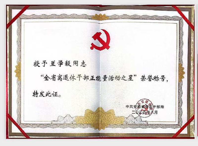 近日,省委老干局通报表扬全省离退休干部正能量活动团队、正能量活动之星。我院退休职工兰学毅同志被授予全省离退休干部正能量活动之星光荣称号,是省地矿局唯一获此殊荣的退休职工。