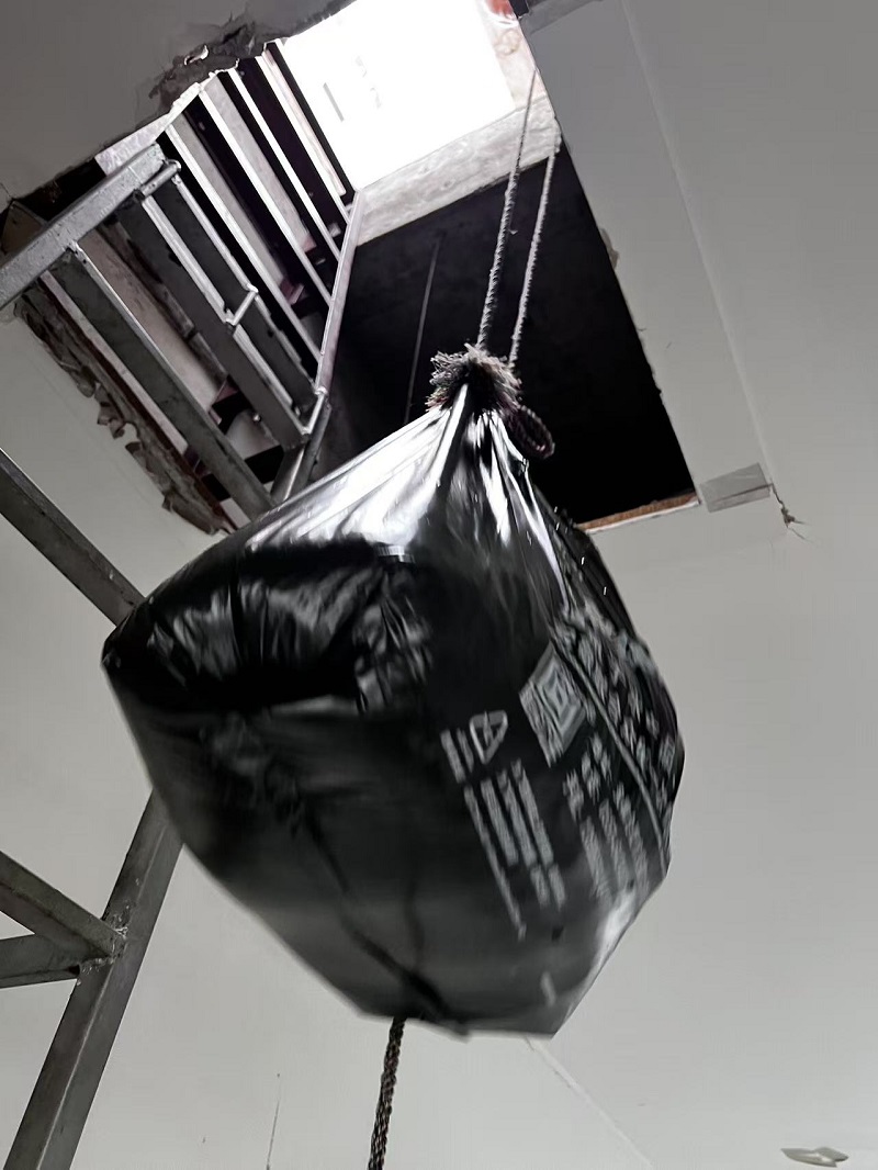 清理现场,工作人员不畏高空作业的风险,逐一对楼顶排水口、下水管道等关键部位进行细致检查。针对管道内堆积的落叶、淤泥、杂物等堵塞物,大家徒手清理、工具疏通,不放过任何一处死角;同时全面清理楼顶堆积的杂物、垃圾,确保排水路径全程畅通。为提升清运效率,工作人员采用绳索吊运的方式,将清理出的杂物安全转运至楼下,避免高空坠物风险,整个过程规范有序、高效推进。