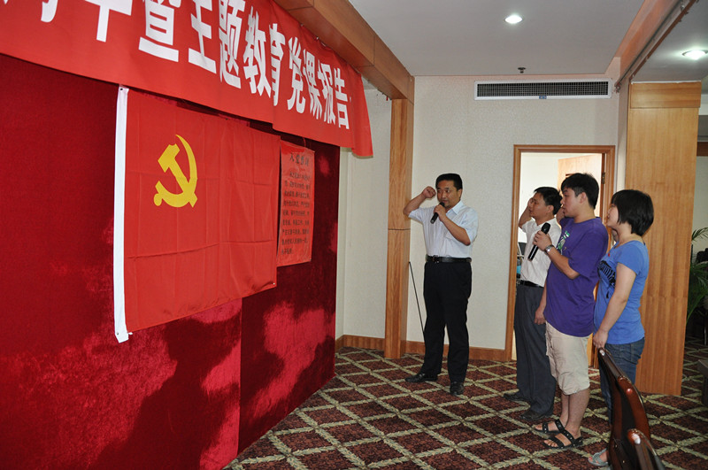 党课报告会之前,进行了新党员的入党宣誓仪式,三名新党员在党办主任毛思斌同志的带领下,面对党旗庄重宣誓加入中国共产党。院副总工程师程培生同志代表新党员发表了讲话。他表示,在这样一个特殊的日子加入中国共产党,内心感到无比的骄傲和自豪。今后一定要按照党员标准严格要求自己,发扬党的优良传统,为地勘事业努力奋斗。李晓荣书记向新入党的同志们表示祝贺,希望他们今后在各自岗位上积极发挥党员先锋模范作用,为促进我院繁荣发展贡献力量。