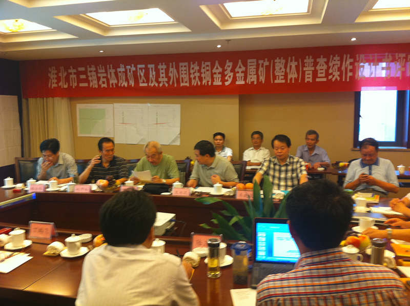 评审组首先听取了汪青松同志关于《淮北市三铺岩体成矿区及其外围铁、铜、金多金属矿整装勘查续作设计书》的汇报,专家组经过审议后一致通过该续作设计方案,并提出了较好的修改意见。省国土厅地勘处副处长王书远在总结发言中对《淮北市三铺岩体成矿区及其外围铁、铜、金多金属矿整装勘查》前期地质找矿成果给予了充分肯定,同时对此次续作设计工作思路、施工方案给予了较好评价,并对本项目整装勘查区登记的10个探矿权工作进行全面部署,要求分批提交成果报告,对有资源量的矿权应独立编制报告优先提交,其它矿权区纳入总报告编写最后提交。