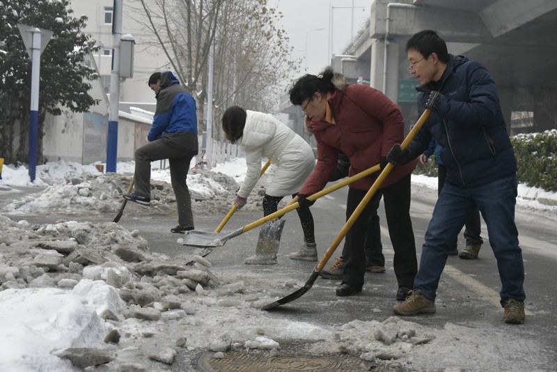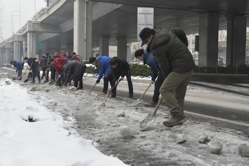 1月29日,勘查技术院几十余名党员干部职工热火朝天地在阜阳北路清理道路积雪。虽然寒风凛冽,大家的手和脸冻得通红,大家不畏严寒,分工明确,纷纷拿起铁锹、扫帚等工具与风雪“搏斗”。经过一个多小时的奋战,道路积雪被清除,保证了周边群众以及车辆的正常出行。