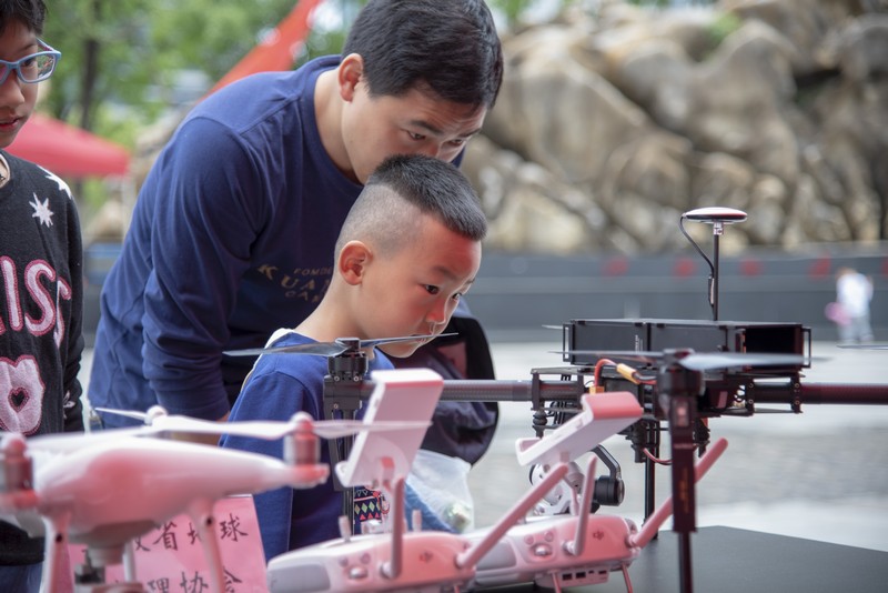 在广场主题活动现场中,无人机吸引了大批市民,特别是小朋友好奇的目光。我院志愿者们讲解了利用无人机技术在地质灾害监测预警方面的应用实例,以及如何为环境和灾害监测预警提供可靠依据。通过实际操作使用罗盘仪,市民们了解了如何测定距离、水平、高差、坡角等常识。