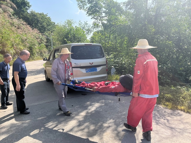 演练模拟了在复电阻率法施工过程中因电线老化破损发生的触电事故。项目组根据预定计划有序开展应急处置:发现呼救阶段,发现施工人员触电倒地,发现者立即通过对讲机呼救并告知中心站人员切断供电电源;脱离转移阶段,随即做好自身防护,用干燥的木棒挑开漏电电线,使触电者脱离危险源,其他应急救援队员用担架将伤者转移至安全环境;应急救护阶段,根据伤者伤情采取必要救护措施(心肺复苏),并拨打急救电话。演练全程秩序井然,配合默契。演练结束后,何家国进行总结点评,提出改进工作建议。