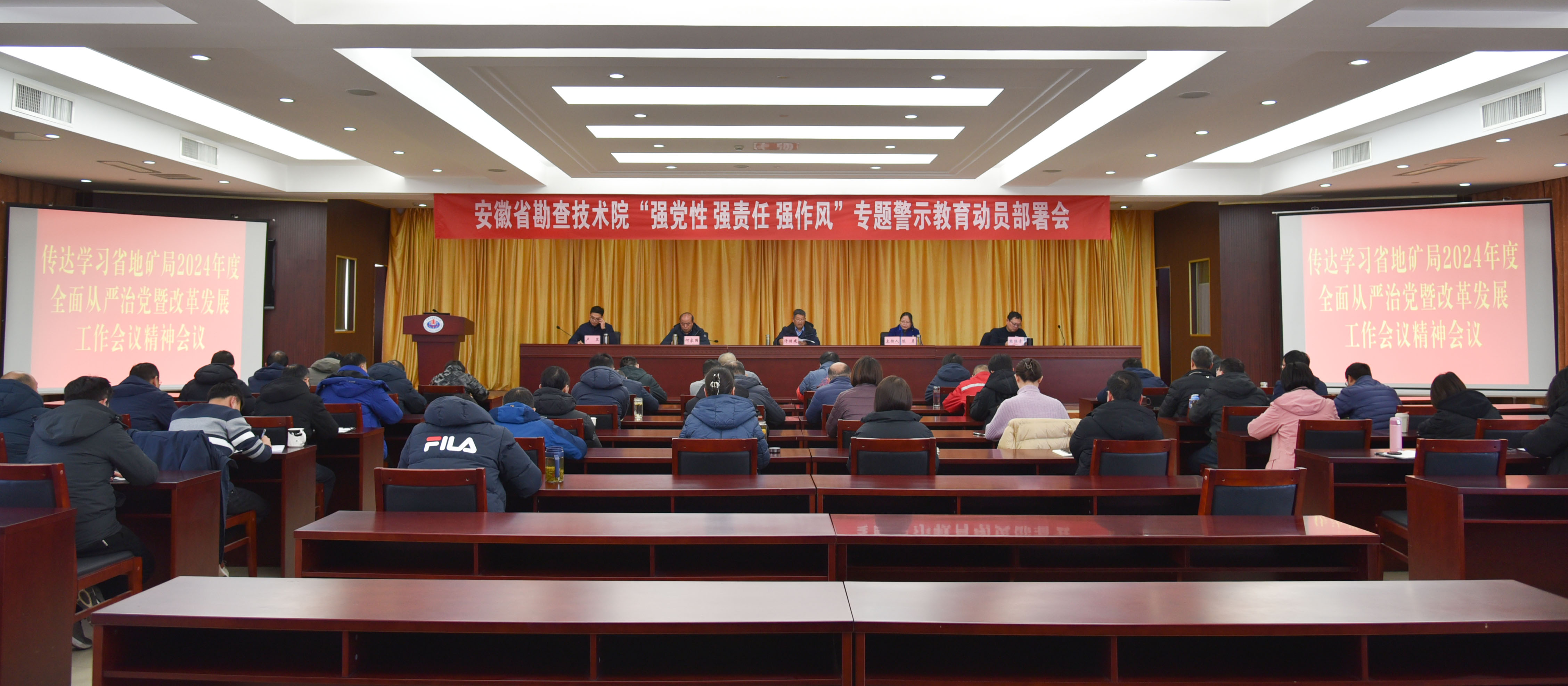 1月23日,我院召开“强党性 强责任 强作风”专题警示教育动员部署会。院领导、首席专家、全体中层干部参加会议?;嵋榇镅傲税不帐〉乜缶?024年度全面从严治党暨改革发展工作会议精神及《安徽省地矿局党委关于开展“强党性 强责任 强作风”专题警示教育工作方案》。