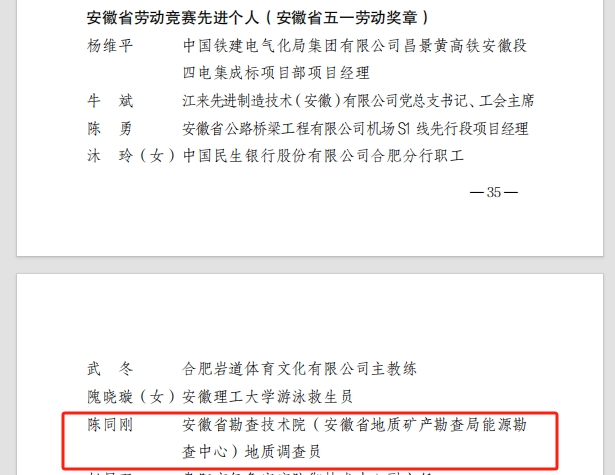 4月28日,从安徽省劳动竞赛委员会、安徽省总工会获悉,综合物探分院《安徽省重要流域自然资源地表基质调查试点》项目组荣获安徽省工人先锋号荣誉称号;地震勘探分院陈同刚同志获安徽省劳动竞赛先进个人(安徽省五一劳动奖章)荣誉称号。