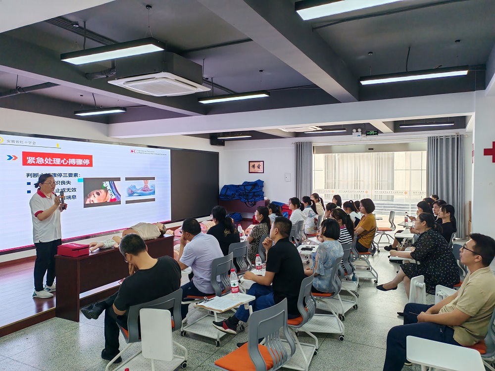 在工作人员引导下,大家详细了解了红十字运动起源、中国红十字会发展史,学习了安全驾车、家庭消防、厨房安全、地震自救等安全知识,亲身体验了火灾逃生模拟设备,进一步加深在紧急情况下保持镇定的重要性和必要性。在应急救护知识专题培训讲座课堂上,大家认真学习了心肺复苏(CPR+AED)、海姆立克法等应急救护知识,以及常见急症处理及预防、意外伤害和突发事件的应急处置知识并进行现场操作练习。