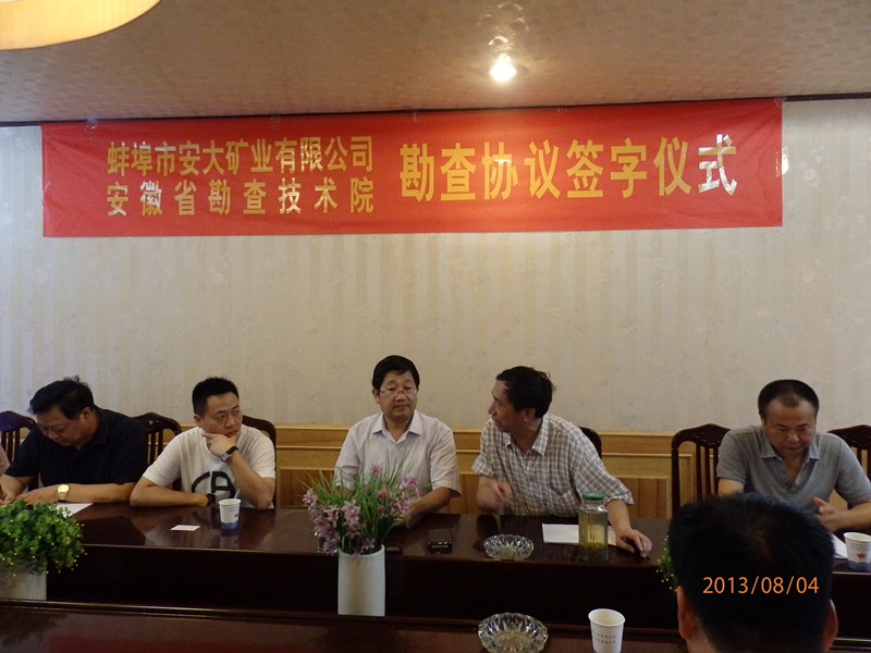 为加深勘查领域合作,大力开拓广阔市场,8月4日我院与蚌埠市安大矿业有限公司在蚌埠基地2楼会议室举行了勘查协议签字仪式,我院院长许传建、党委书记兼总工程师汪青松、副院长汤正江,蚌埠市安大矿业有限公司董事长许忠安、总经理孙宝荣等出席。