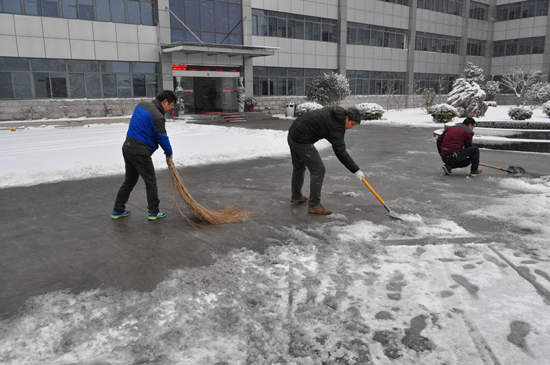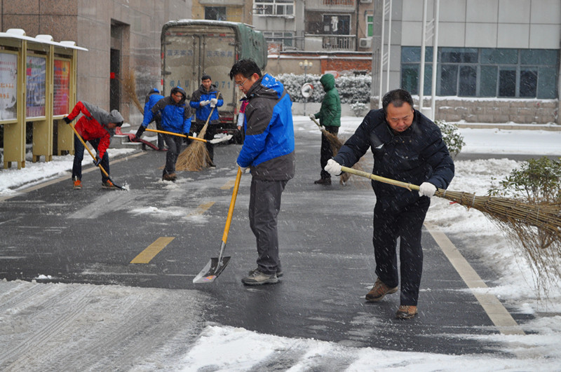 为保障广大干部职工出行安全,11月28日一大早,院长许传建、副院长汤正江和纪委书记李东海带领后勤服务中心、院办公室、安??频瓤剖也棵诺母刹恐肮ぃ诎旃デ蚩够┣迳üぷ?。他们有的用笤帚清扫,有的拿着铁锹铲雪。此时天空仍然纷纷扬扬飘着雪花,天气也格外寒冷,大家的双手和脸都冻得通红,一不小心雪水就从鞋帮里渗进去,弄湿了鞋袜,却丝毫没有影响大伙儿的干劲。