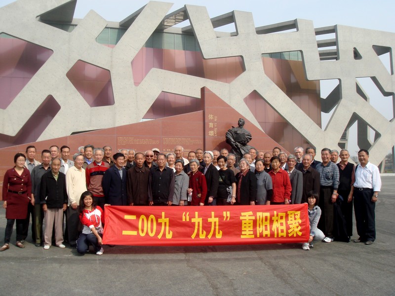 老地质工作者在蚌埠龙湖体育馆前留影