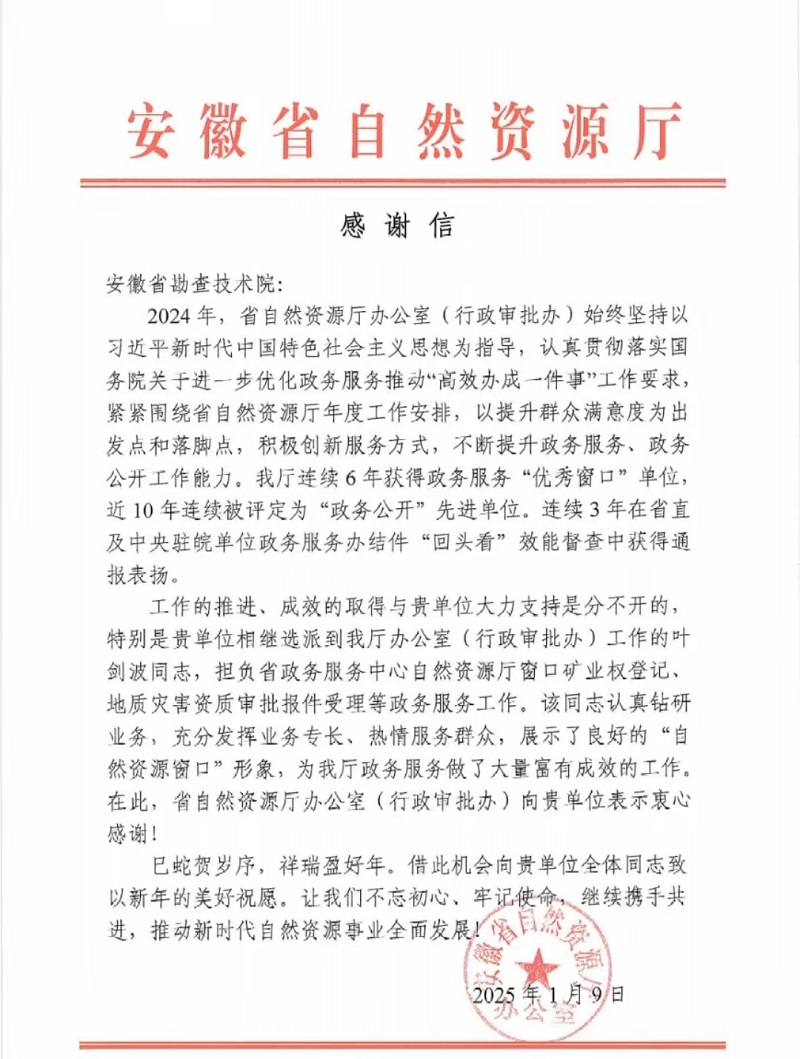 信中提到,省自然资源厅办公室(行政审批处)工作的推进、成效的取得与我院的支持是分不开的。我院叶剑波同志在选派期间认真钻研业务,充分发挥业务专长、热情服务群众,展示了良好的“自然资源窗口”形象,为厅政务服务工作做了大量富有成效的工作。(电法勘探实验室 穆海棠)