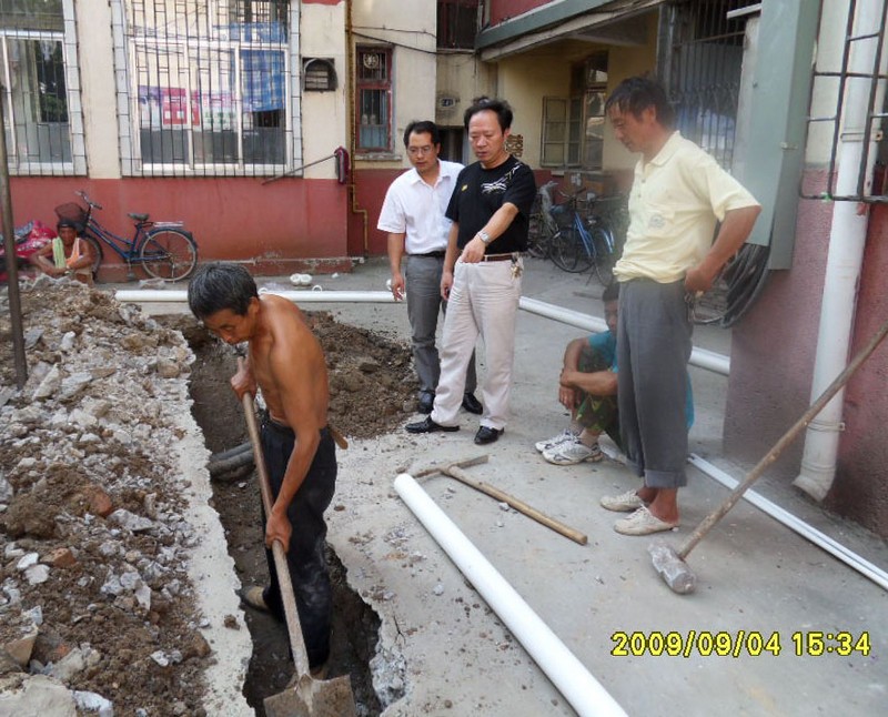 目前,在院物业公司的协调和监督下,一期职工生活区水、电改造施工正有序进行,其他三个生活区的供电供水改造项目也将在今明两年内完成。图为物业公司对水电改造施工进行质量监督。(物业公司)