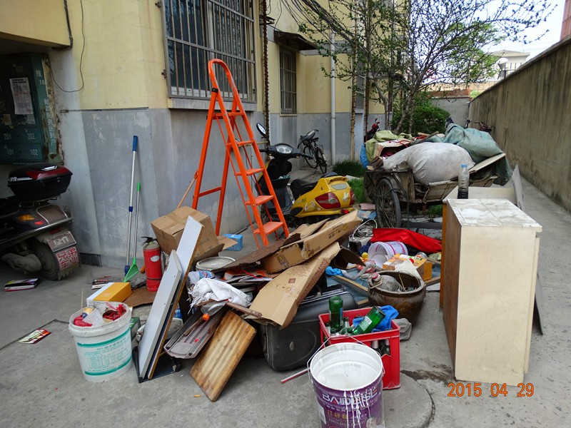 此次排查工作主要针对小区楼道内堆放的废旧杂物进行整治清理。经检查,各小区单元楼道内均不同程度地堆放着纸箱、旧桌椅、煤炉煤球、煤气罐、脸盆架等易燃物。蚌埠管理处于4月16日在各小区张贴了自行清理存放楼道杂物的通知,28日又对堆有杂物的楼道住户进行挨家挨户的清理告知。随后,管理处花费两天时间清理出堆放于各楼层的杂物共12车。