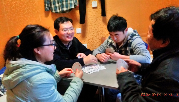 12月22日,冬至那天,在野外的职工们自己动手买食材,拌馅的、和面的、擀皮的、包捏的、蒸煮的,大家伙儿互相配合,其乐融融,一桌丰盛的饺子大餐,一会儿就端上桌了。24日,平安夜,刚收工回来的职工们来不及洗去风尘,就投入到激烈的“掼蛋”比赛当中,大家在激烈的对抗中开心大笑,气氛热烈。夜幕悄悄降临的时候,一场动听的歌唱会,又开始上演了……