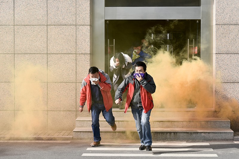 此次演练模拟场景为该院科研业务楼发现火源,浓烟和火苗冒出,多人被困楼内?;鹪址⑸?,应急处置指挥部立刻拉响消防警铃,同时发出疏散广播通知。听到消防警报后,楼内全体职工迅速用湿毛巾捂住口鼻,俯低身体,迅速有序地从消防通道紧急撤离至院内操场。操场上,刘任还就自救呼吸器、灭火器等消防器材的使用进行了演示讲解。职工实际操作了灭火器的使用。