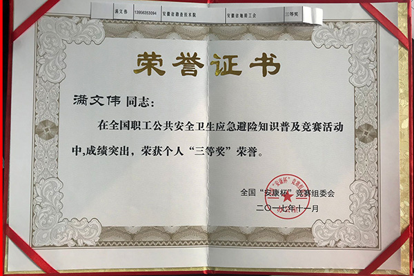 近日,从全国安康杯竞赛组委会获悉,我院职工郭佳在2017年度全国“安康杯”竞赛安全文化宣传工作活动中表现突出,荣获全国职工公共卫生安全应急避险知识普及及竞赛活动“组织优秀个人”荣誉称号。我院职工满文伟获全国职工公共卫生安全应急避险知识普及及竞赛活动个人“三等奖”。(郭佳)