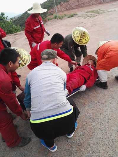 在安保科和项目组的的配合下,演练模拟作业小组在山区竹林作业突发一作业人员被五步蛇咬伤。事故发生后,组员立刻放下手中工作,进行紧急救治;一人用木棍驱赶周边的可能没有逃走的蛇类并记下蛇的外形,抛洒随身携带的雄黄粉;一人迅速掏出蛇药给伤者服用;之后用小刀在伤口处割开小口子,用携带矿泉水反复冲洗,并且向外挤压伤口将毒液挤出。清洗完毕后,利用随身携带的皮带或者红布条,在伤口上处5-10cm处捆扎,阻断毒液循环。之后再将蛇药捣碎进行外敷包扎。与此同时组长即刻通知随行施工车辆在合适的位置进行等待。并与项目部取得联系。项目部接到电话后,立即赶往现场并同时拨打已联系过的医院急救电话,开通医院绿色通道,必要时要求救护车接应。
