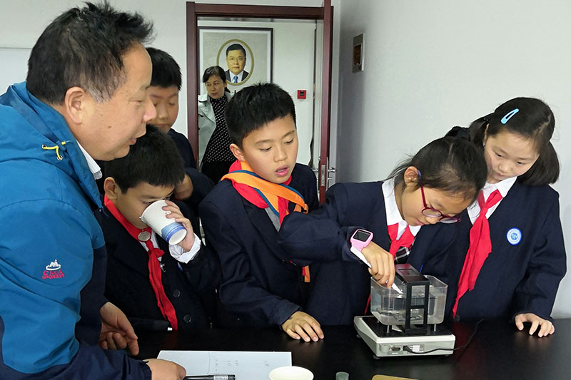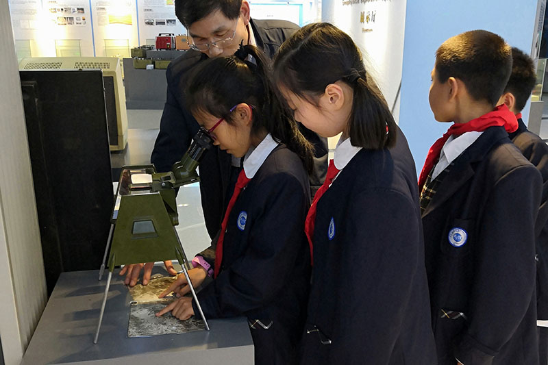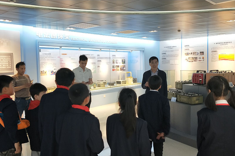 走进科普基地,小成员们被眼前130余台套仪器设备深深地吸引了,这些仪器涵盖了电法、磁法、重力、测井、地震数据处理、测地等物探勘查领域。面对懵懂的四年级学生,科普基地讲解员事先作了认真的准备,用通俗易懂的语言并与生活知识相结合,把“给地球做CT”的地球物理勘探方法,讲解给孩子们,将深奥的物探科技知识潜移默化地印在孩子们的脑海中。在“地球物探探测仪器设备”展示厅,孩子们在航空立体镜下看见平面的航片,立刻显现成错落有致的立体山川。提问环节,孩子们争先恐后地提问,科普办主任杨建在耐心地解答中将我院“勘查行业领先,技术成果一流”的品牌形象刻在了他们幼小的心里。现场体验中,科普志愿者何泽平一边讲解一边做快速准确探测地下管线的小实验,寓教于乐的小游戏让每个爱动手操作的孩子都过了一把“小小探测家”的瘾;高级工程师杨胜贤一遍又一遍地教孩子们做岩石密度测试小试验。一台小小的测试仪器,通过空气称重与水测量的差就能测算出岩石的体积,再将空气称重数据除以岩石的体积就测算出它的密度,孩子们听得津津有味,排着队聚精会神地做起试验……