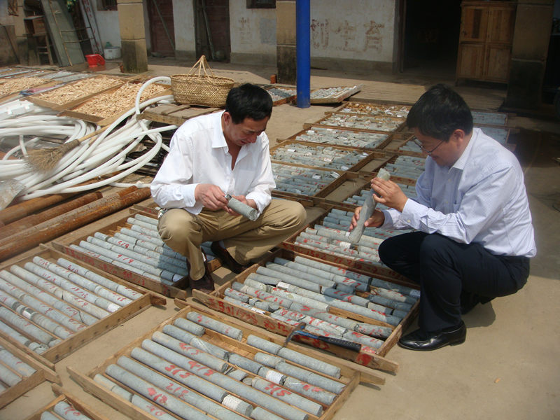 5月21日,院长许传建、副院长兼总工程师汪青松一行赴我院鑫联矿业公司铜陵市五马山矿区检查指导工作。到达矿区后,院领导在炎炎烈日下仔细查看钻孔岩心,观察矿化蚀变情况,并向现场技术人员询问具体含矿段分布情况。