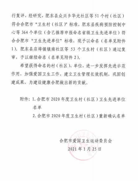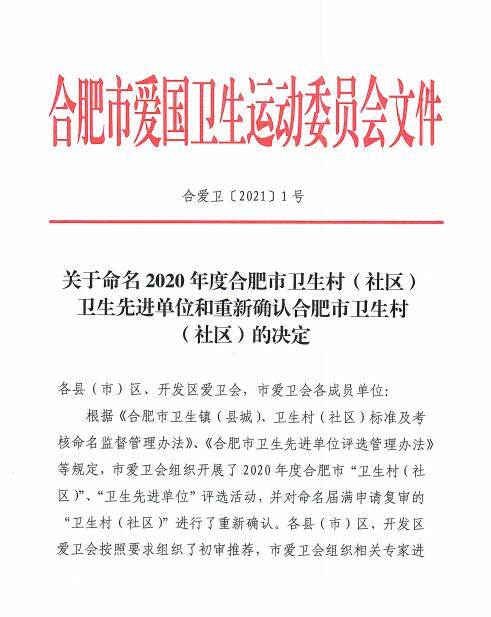 1月25日,合肥市爱国卫生运动委员会印发《关于命名2020年度合肥市卫生村(社区)卫生先进单位和重新确认合肥市卫生村(社区)的决定》,我院荣获“2020年度合肥市卫生先进单位”荣誉称号,是唯一获得此项荣誉的局属地勘单位。