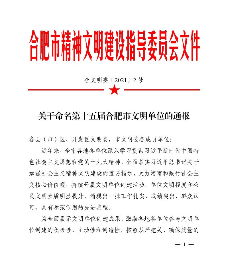 1月23日,我院荣获“第十五届合肥市文明单位”称号。这个冬天,发展日新月异的庐州城见证了我院文明之花的绽放。合肥市文明单位是综合性荣誉称号。自2015年我院首次申报便成功获得合肥市文明单位荣誉称号至今,我院已经连续三届蝉联此项荣誉称号,成为我院文明创建工作全面推进、持续深入的有力注解。