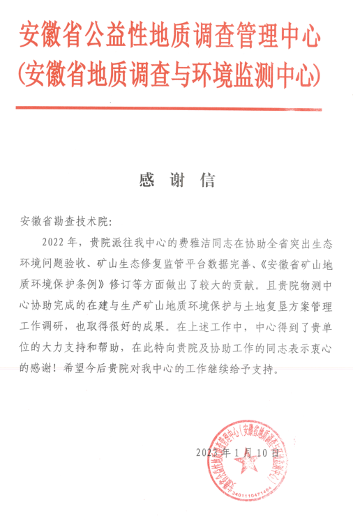 我院收到省公益性地质调查管理中心感谢信