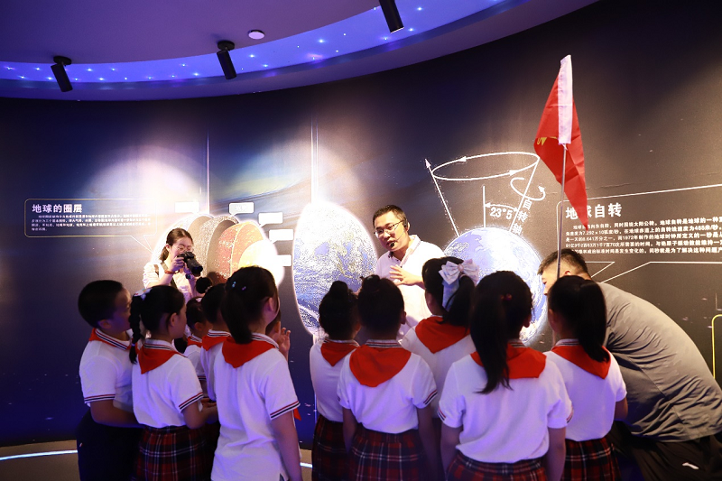 在地球起源与演化展区,基地工作人员与来访者亲切互动,探讨地球的形成演化和内部构造