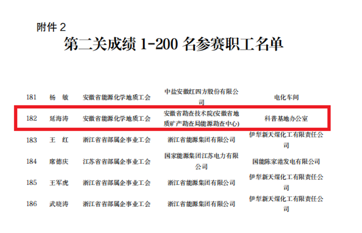 近日,省能源化学地质工会印发《关于2024年长三角地区能源化学地质产业“安康杯”职工安全生产知识网上竞赛结果的通报》,我院职工延海涛荣获个人二等奖。