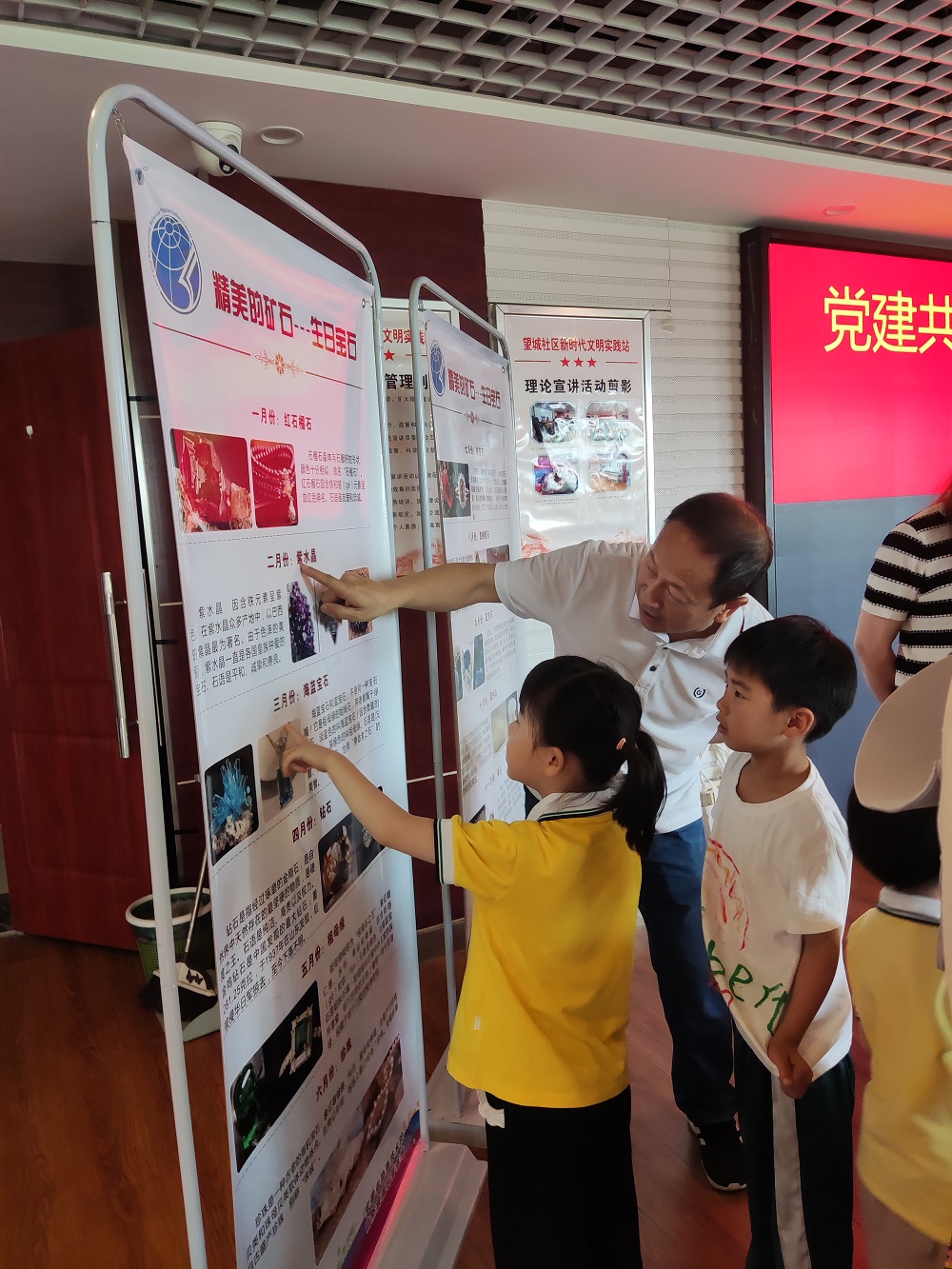 活动现场,信息中心党支部党支部的党员干部带领北环阳光幼儿园的小朋友开启了一场关于“神奇的石头”的科普之旅。奇形怪状的岩石、五彩斑斓的宝石、能吃的岩石、神秘美丽的化石以及黝黑斑驳的陨石的奥秘解读和科学实验,激发了孩子们强烈的好奇心和探索欲。讲解结束后,小朋友们和岩石矿物标本进行了零距离接触,提升了直观体验?;疃殖⌒∨笥衙侨惹槁?,互动效果良好。